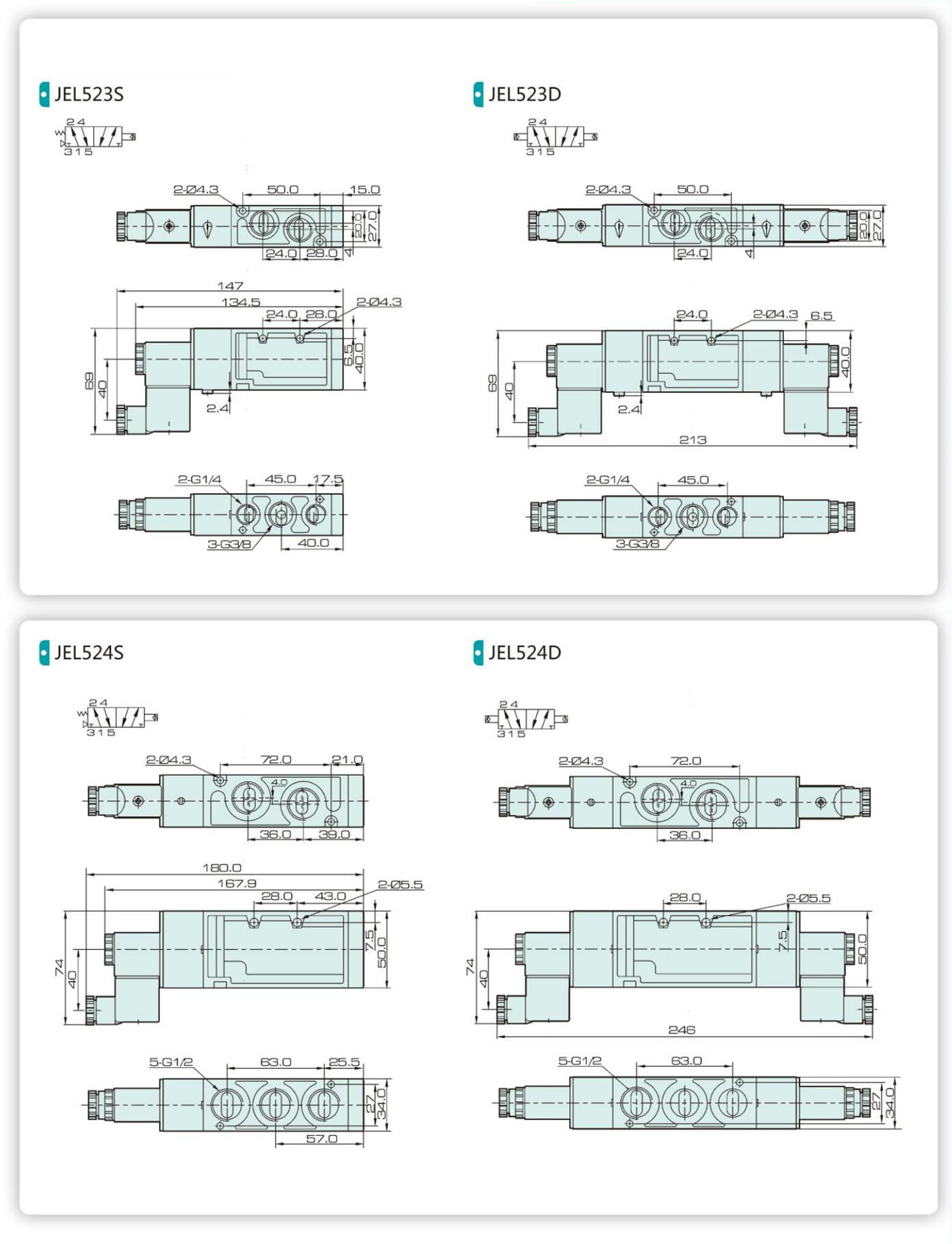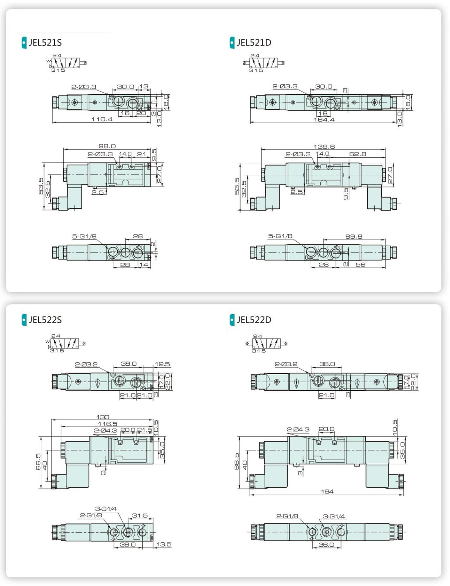 | 밸브 유형 | 5/2 웨이 | 5/3 웨이 | 5/2 웨이 | 5/3 웨이 | 5/2 웨이 | 5/B 웨이 | 5/2 웨이 | 5/3 웨이 | ||||